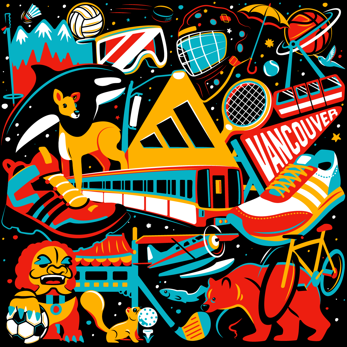 I was hired to design and paint a large mural on the Granville Island Brewery in Vancouver, BC through VMF 2022. The creative direction was to highlight the unique opportunities and activities we have around us in British Columbia, focusing on fun and leisure in the outdoors. VMF worked with the building tenant Granville Island Brewing to gain approvals from the building owners (CMHC) for painting a mural on the exterior facade of the brewery. Granville Island Brewing created a new visual identity for their brand and was looking to add a mural to augment its brand’s connection to Vancouver and the creative energy of Granville Island.